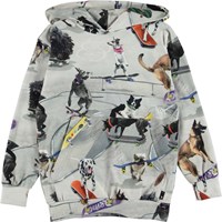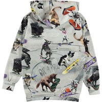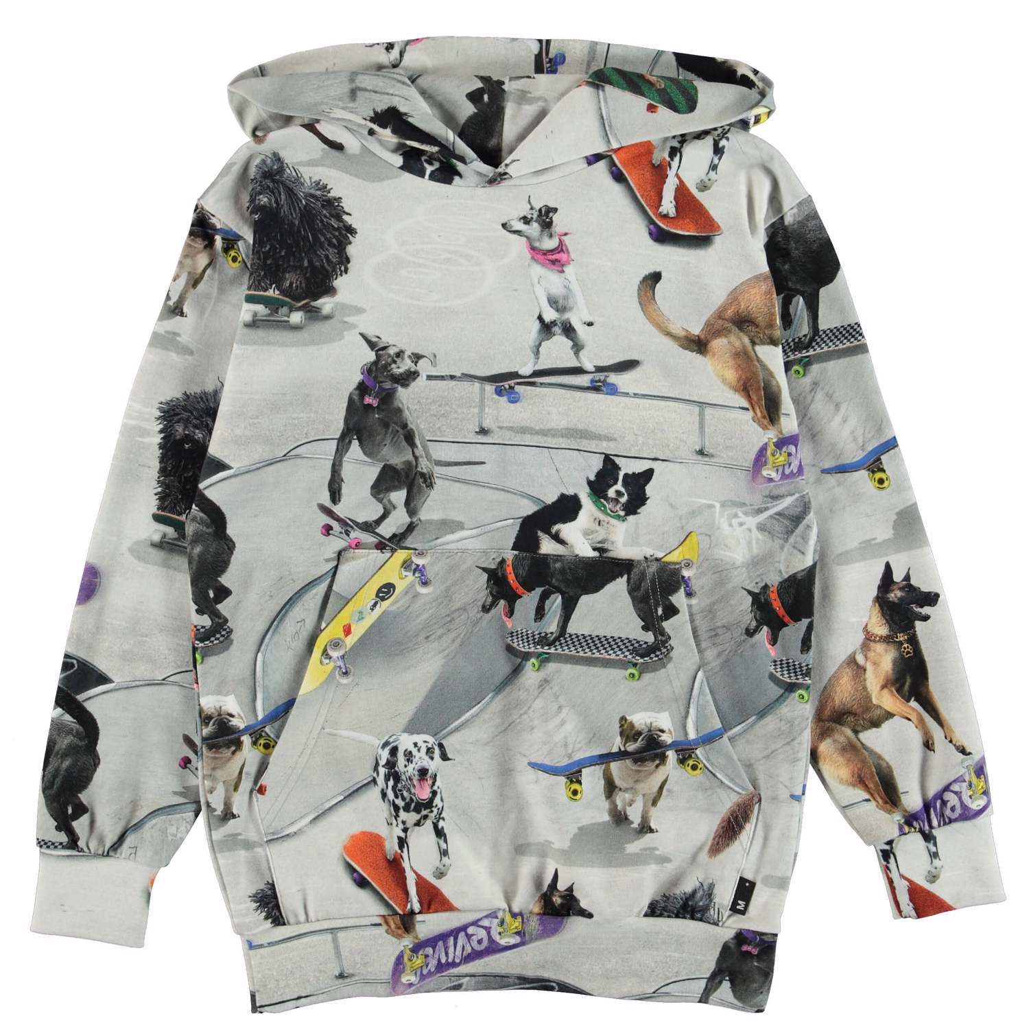 Romo er en hættetrøje med kængurolomme og print af hunde som står på skateboard.