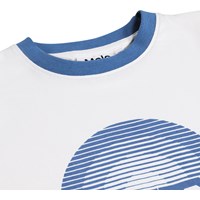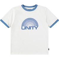 Hvid t-shirt i økologisk bomuld med korte ærmer og blå ribkanter ved hals og ærmer. T-shirten har en løs pasform og et print på fronten med teksten Unity.