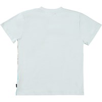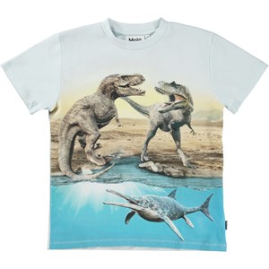 Roxo er en lyseblå t-shirt med print af en kamp imellem to T-Rex'er, mens en dinosaur under vandet kigger på.