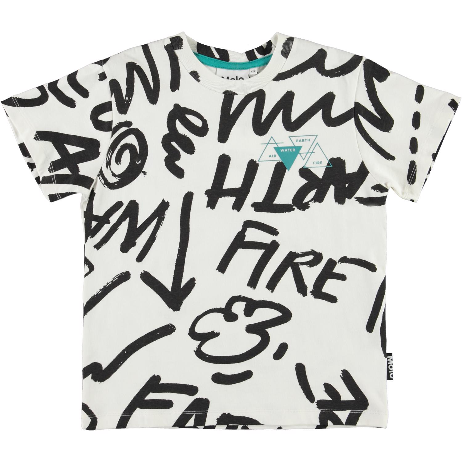 Roxo er en hvid t-shirt med tekst og symbol print af de fire elementer i sort.