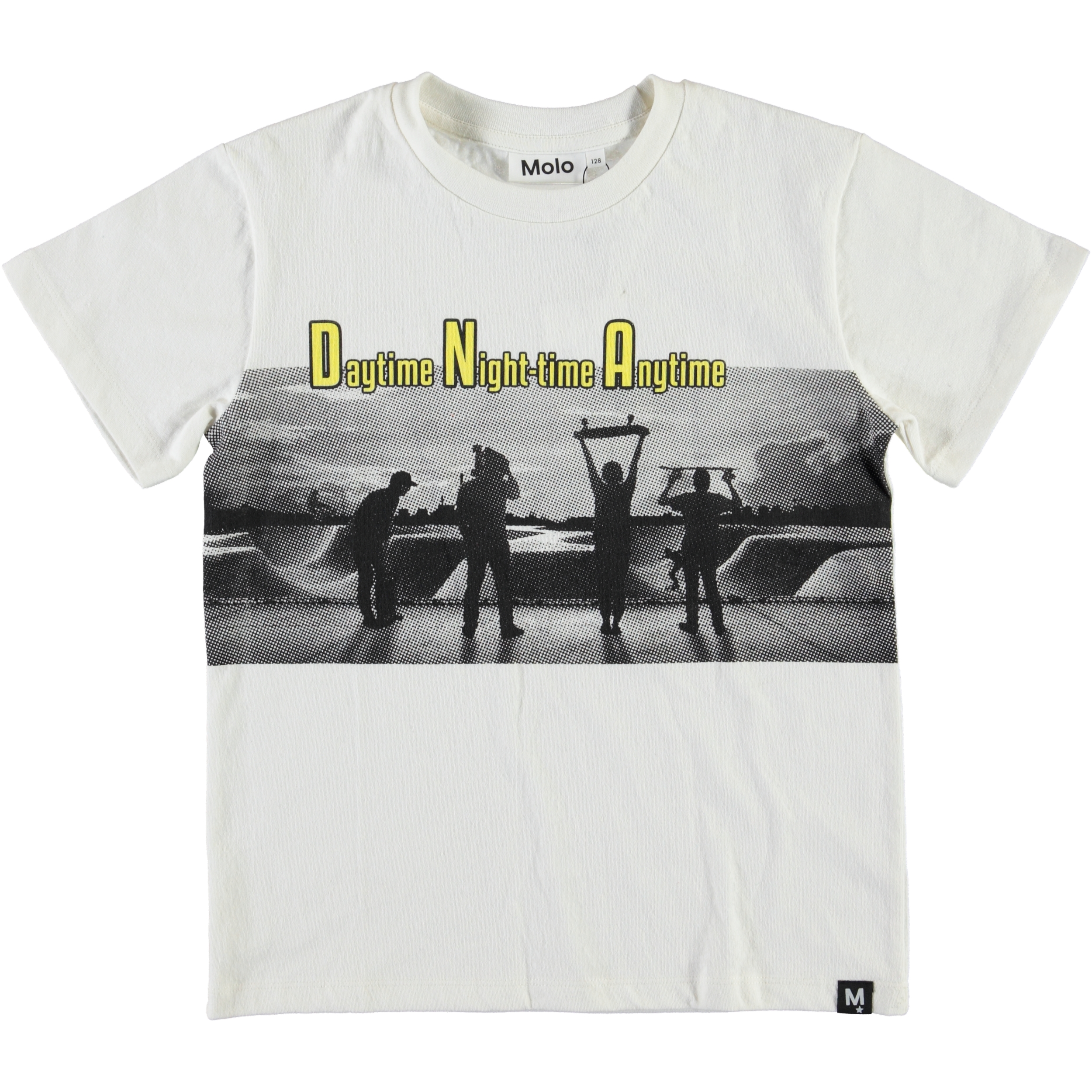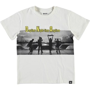 Roxo er en hvid t-shirt med skate print og teksten "Daytime Night-time Anytime" i gult. Roxo har korte ærmer og er i 100% bomuld.