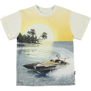 Roxo er en hvid T-shirt, som har en speedbåd ved en tropisk palme ø og solnedgang på fronten.