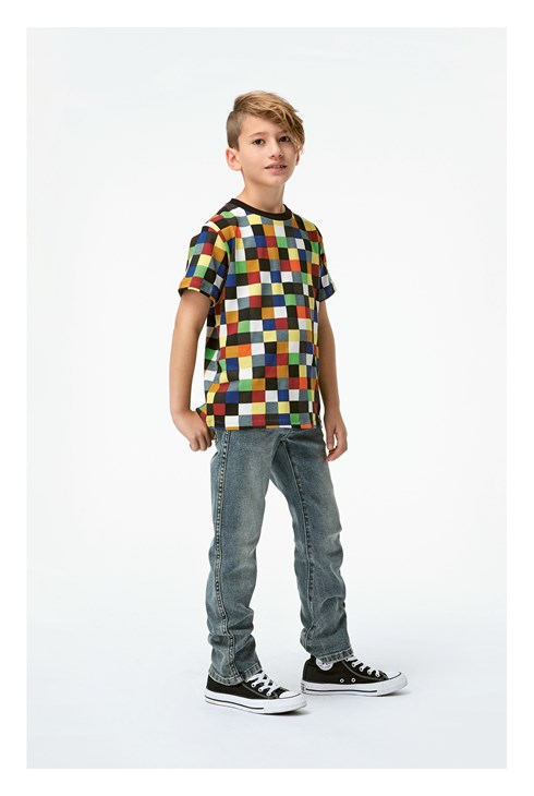 Printet på t-shirten Roxo har flotte farvede felter, som er pixels helt tæt på. T-shirten har sort kantebånd ved hals udskæringen.