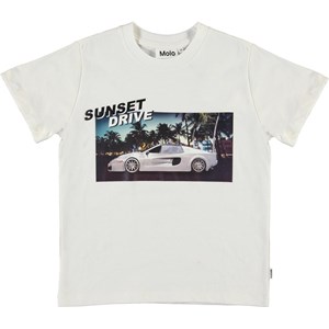 Roxo er en hvid t-shirt med print af en hurtig bil, palmer, samt teksten 'Sunset drive' på fronten.