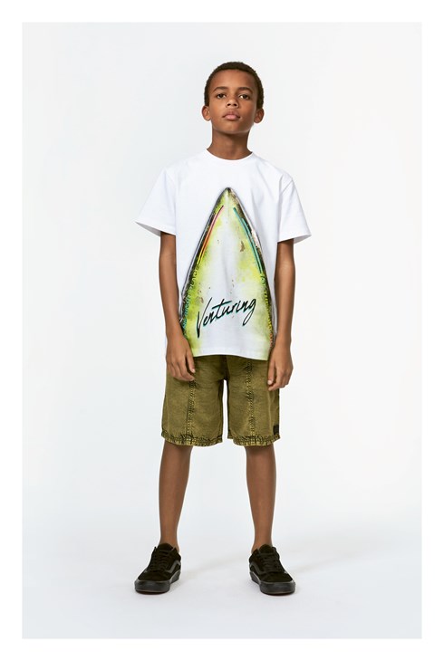 Roxo er en hvid t-shirt med print på fronten af et surfboards spids. Roxo er i 100% bomuld og har korte ærmer.