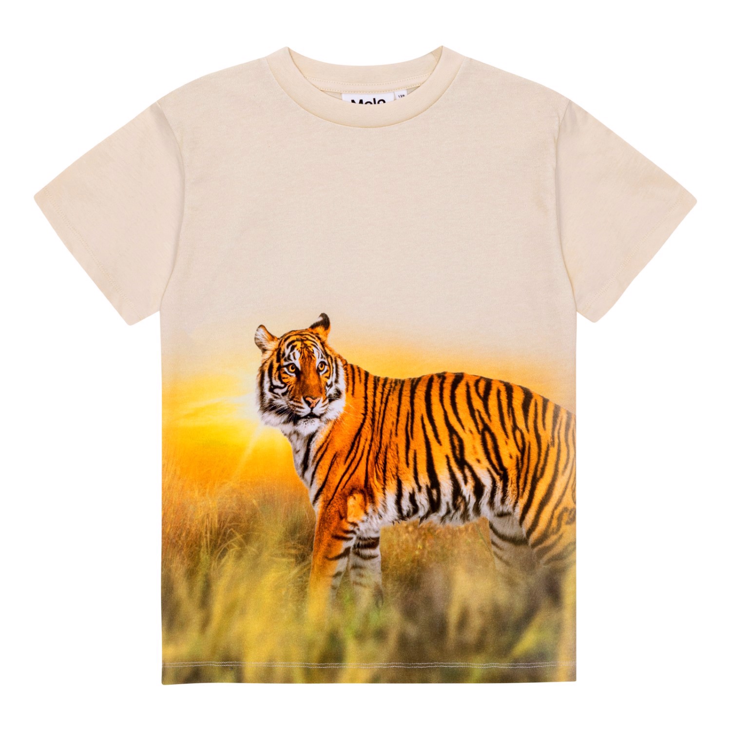 T-shirt med placement frontprint i beige og orange nuancer i økologisk bomuld. Printet på fronten viser tiger i skumringen, på jagt efter en aftensnack. Måske han bare skulle spise en gulerod? Roxo har en rund halsudskæring med ribkant, samt en almindelig pasform.