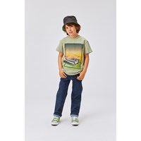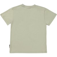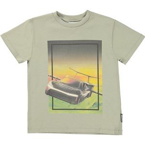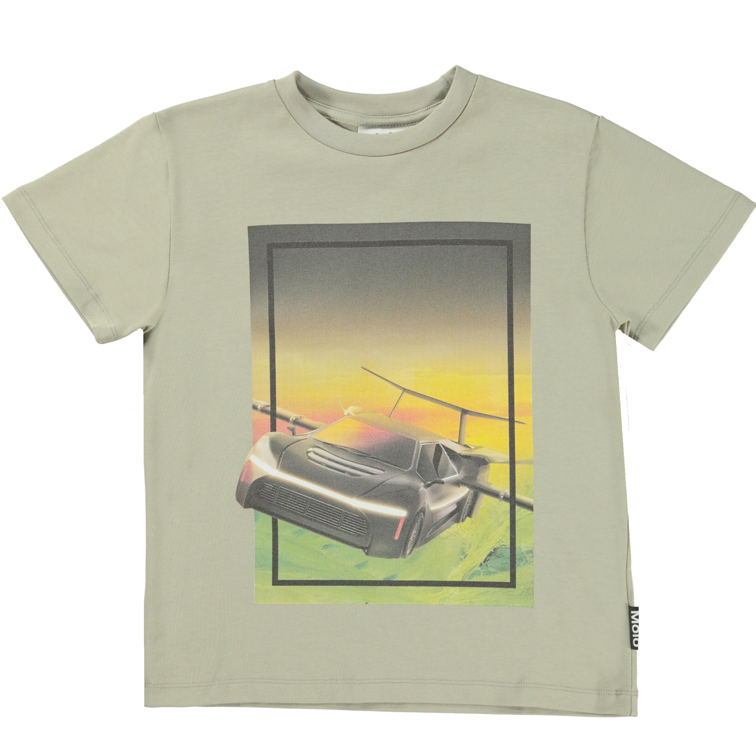 Roxo er en mosgrøn t-shirt i økologisk bomuld. På forsiden af Roxo, er det et print med en flyvende bil, med solnedgangen i baggrunden.