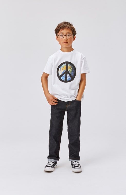 Roxo er en hvid t-shirt i økologisk bomuld. På forsiden har Roxo et print af en jordklode med et peace tegn på.