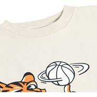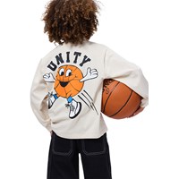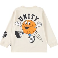 Beige, langærmet bluse i blødt økologisk bomuld med ribkanter ved halsudskæring og ærmer. Blusen har en løs pasform og basket-inspireret print samt teksten 'Unity.