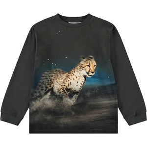 Sort langærmet bluse i økologisk bomuld med ribkant i hals og ærmer. Blusen har et stort print af en gepard i en mørk nat.