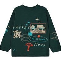 Mørkegrøn langærmet t-shirt med placement print. Printet er lavet som en grafisk collage, inspireret af de slørede linjer mellem den virkelige verden og den verden man kan finde online. ”Energy Flows” udforsker lighederne, frem for modsætningerne mellem disse 2 verdener. Du vil kunne finde elementer inspireret af computer grafik som fx. pop-up vinduer, 3D skitser, men også billeder af virkelige træer. Denne langærmede t-shirt er fremstillet i 100% bomuld, har en rund halsudskæring med ribkant, ribkant ved ærmer, samt et loose fit. Tag evt. en kortærmet t-shirt udover, for et cool lag-på-lag look.