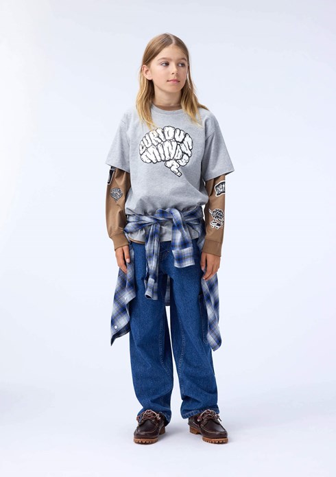 Brun langærmet bluse i økologisk bomuld med ribkanter ved halsudskæring og ærmer. Blusen har en løs pasform med små sorte og hvide print af klistermærker med sjove og søde udsagn.