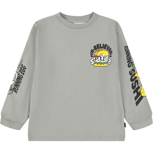 Grå langærmet bluse i økologisk bomuld med ribkanter ved halsudskæring og ærmer. Blusen har en løs pasform med et farverigt print af levende mad og sjove udsagn.