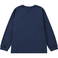 Mørkeblå bluse i økologisk bomuld med lange ærmer, rund halsudskæring, ribkant i halsen og ved ærmerne. Den har en løs pasform og et placement print på fronten. Vidste du, at mange flere dinosaurer, end man troede, havde fjer? På dette print ses to dinoer, der leger, ligesom stjernerne er kommet frem på nattehimlen.