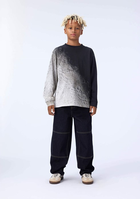 Sort, langærmet bluse i økologisk bomuld med ribkanter ved halsudskæring og ærmer. Blusen har en løs pasform med frontprint af en kat på skateboard.
