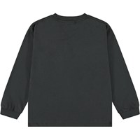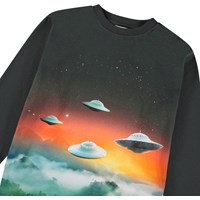 Sort langærmet bluse i økologisk bomuld med ribkant i hals og ærmer. Blusen har et stort frontprint af en varm himmel med ufoer svævende over en jungle.