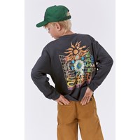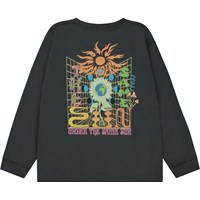 Sort langærmet t-shirt med placement print på både front og ryg. Frontprintet er en solsikkeblomst med en jordklode som centrum. På ryggen ses et grafisk og farverigt print, hvor jordkloden igen er i solsikkens centrum.  På hver side er den omgivet af månens forskellige faser, og ovenover, har den selveste solen. Hvis du ser godt efter, kan du se at solens flammer bliver til bogstaver, der staver ordet ”Under”, og hvis du læser videre får du det færdige budskab. ”Under the same Sun”. Denne langærmede t-shirt er fremstillet i 100% bomuld, har en rund halsudskæring med ribkant, ribkant ved ærmer, samt et loose fit. Tag evt. en kortærmet t-shirt udover, for et cool lag-på-lag look.