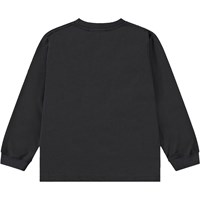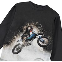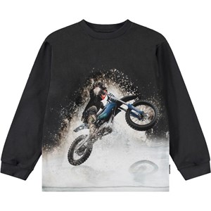 Sort langærmet bluse i økologisk bomuld med ribkant i hals og ærmer. Blusen har en løs pasform og et frontprint af en motocrosskører i fuld fart.