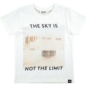 Kortærmet, hvid t-shirt med digitalt print af højhuse og grafisk tekst.