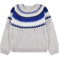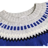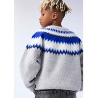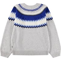 Lysegrå striktrøje i uld med blåt nordisk inspireret mønster. Trøjen har rund halsudskæring, raglanærmer, ribstrikkede kanter og en almindelig pasform.