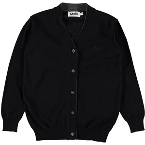 Basel er en langærmet, sort cardigan i fintstrikket bomuld med rib ved hals, ærmeafslutning og bund. Cardiganen har diskret Molo broderie på venstre bryst.