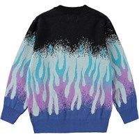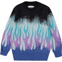 Striktrøje i blålige nuancer fremstillet i økologisk bomuld. Trøjen har en rund halsudskæring med ribkant og rib ved håndled og hofte. Den har en løs pasform og et grafisk flammemotiv placeret i bunden af ærmer og krop i en gradueret farveskala fra blå til lilla, turkis, lyseblå og sort, hvilket skaber en illusion af flammer, der slikker op ad trøjen.