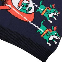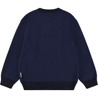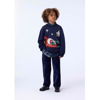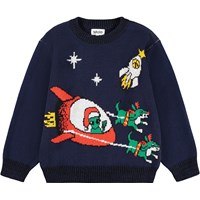 Mørkeblå striktrøje i bomuldsblanding med en rund halsudskæring, ribkant ved håndled og hofte. Trøjen har en løs pasform og mønster af alien-jul i rummet.