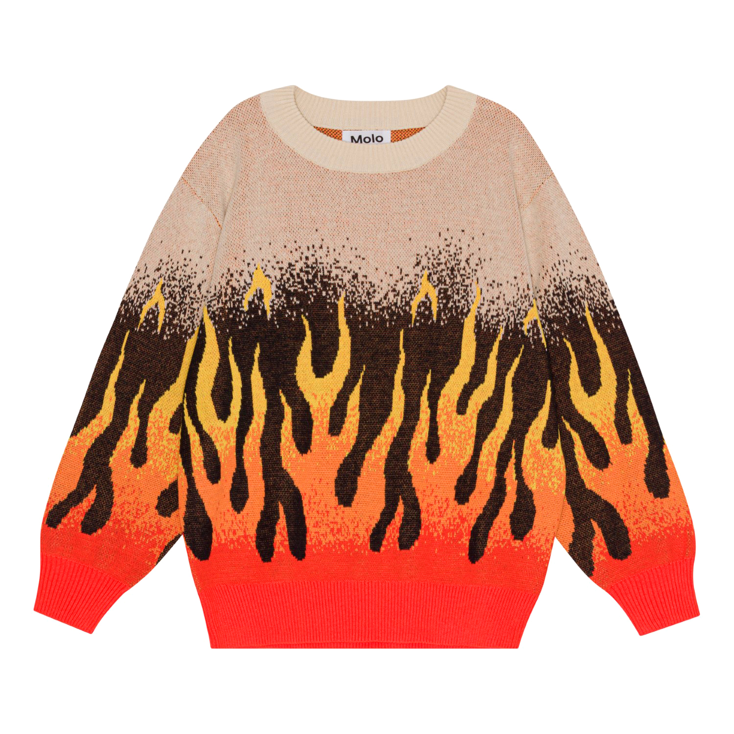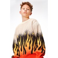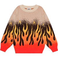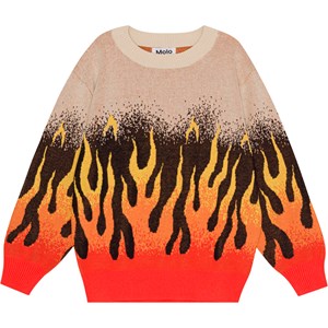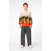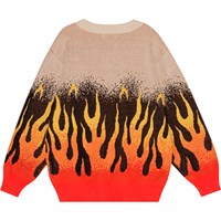 "Beige økologisk striktrøje med et grafisk flammemotiv. Flammerne er placeret i bunden af af ærmer og krop og er en gradueret farveskala fra rød over orange og til gul, som giver en illusion af at flammerne slikker op af trøjen. Trøjen har en løs pasform, en rund halsudskæring med ribkant og ribkant ved håndled og hofte.