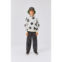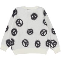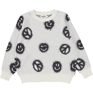Bello er en hvid striktrøje med smileyer og peacetegn. Striktrøjen har desuden ribstrik kant ved både hals, ærmer og hofte.