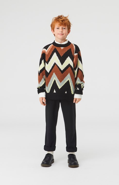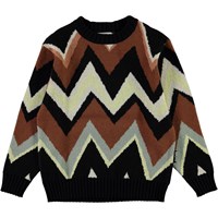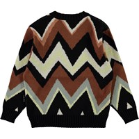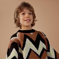 Bello en en strikbluse med flot zig zag mønster i brun, gul og sort.