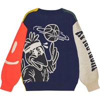 Multifarvet strikcardigan i bomuld/uld med V-halsudskæring, knapper, ribstolpe og rib ved ærme og hofte. Cardiganen har en almindelig pasform og et college-inspireret mønster, hvor der kombineres forskellige elementer fra "Worldplay" kollektionen. På det ene ærme og på fronten er der teksten "Worldplay", mens der på det andet ærme ses et stort smil. På fronten ses også en glad basketball, mens der på ryggen er en atletisk cartoon fugl, som bare er vild med basket.
