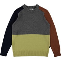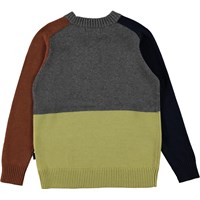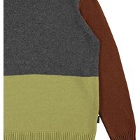Buzz er en color-block strikbluse i blå, grå, gul og brun. Strikblusen har rund hals og rib ved krave, ærmeafslutning og bund.