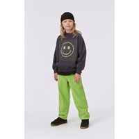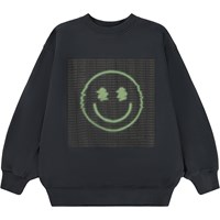 Sort sweatshirt med grønt computer glitch frontprint. På printet ses et stort smilende ansig med glitch i kanten, på en baggrund af computerkoder. Denne sweatshirt er fremstillet i 100% bomuld, har rund halsudskæring med ribkant, ribkanter ved både hofte og ærmer, samt et regulært fit.