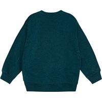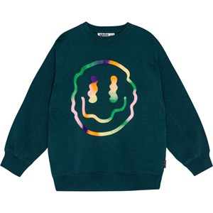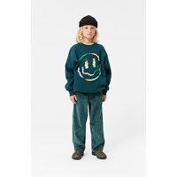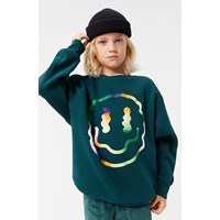 Grøn sweatshirt i økologisk bomuld med en børstet inderside, der gør den dejligt blød og varm at have på. Sweatshirten har en løs pasform, lange ærmer med lave skuldersømme, rund hals, ribkanter samt et placeret frontprint af et multifarvet, smilende ansigt, der laver et glitch.