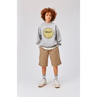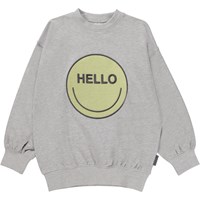 Mar er en gråmeleret sweatshirt med broderet smiley på fronten med teksten 'hello'. Sweatshirten har ribkant ved hals, ærmer og hofte.