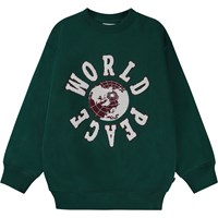 Mørkegrøn sweatshirt med stort frontbroderi. Det hvide og bordeaux broderi forestiller en jordklode, og sender os budskabet om "World Peace". Denne sweatshirt er fremstillet af 100% bomuld, har en rund halsudskæring med ribkant, ribkant ved hofte og ærmer, samt et loose fit. Match evt. denne sweatshirt med bukserne, Adan, i samme farve, for det perfekte sæt.