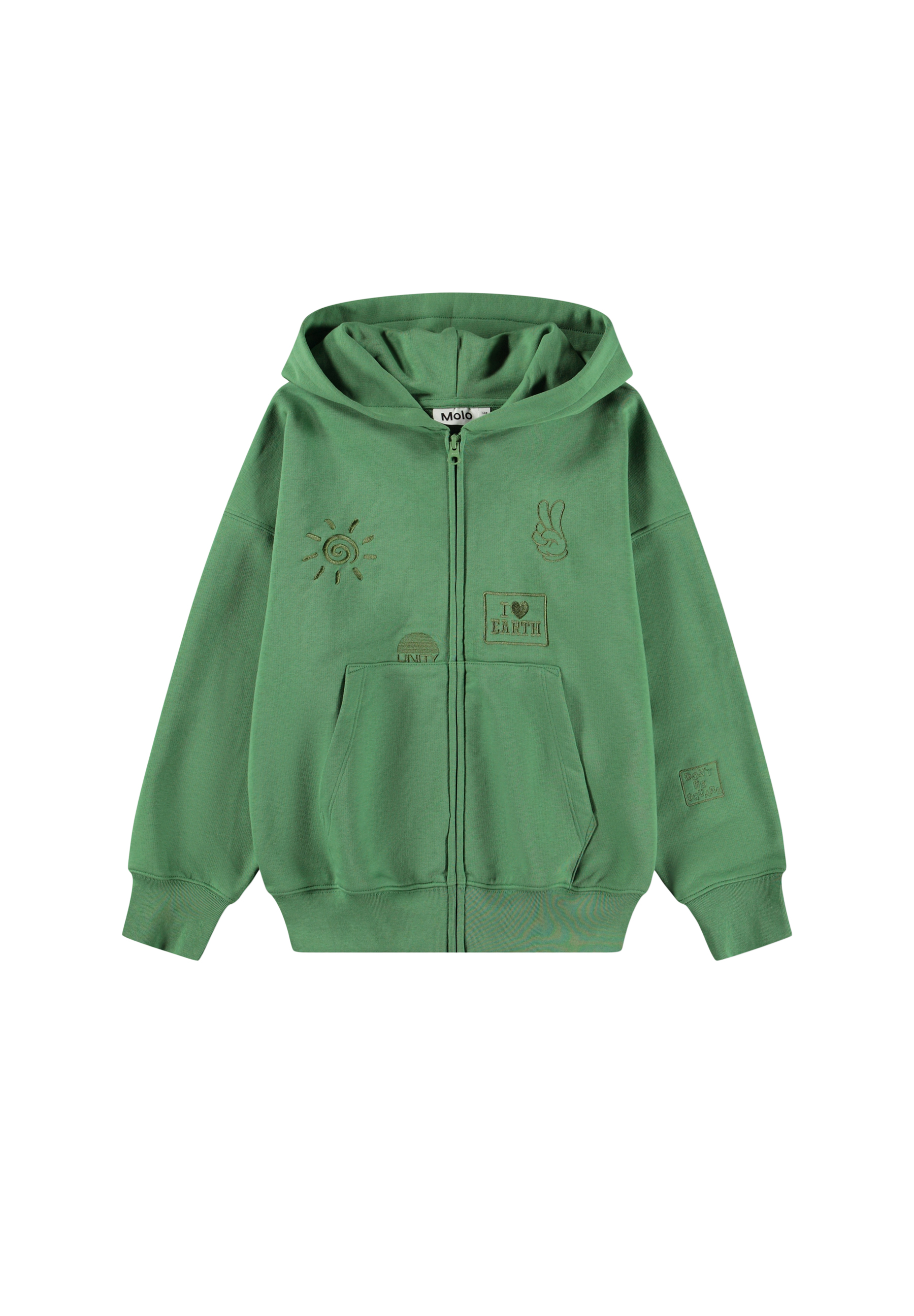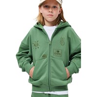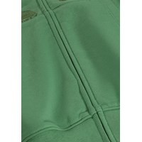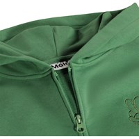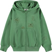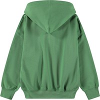Grøn hættetrøje i blødt bomuld med kængurulomme, lynlås foran og ribkanter ved håndled og hofte. Sweatshirten har en løs, afslappet pasform med små broderier på fronten.