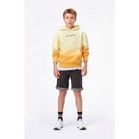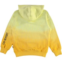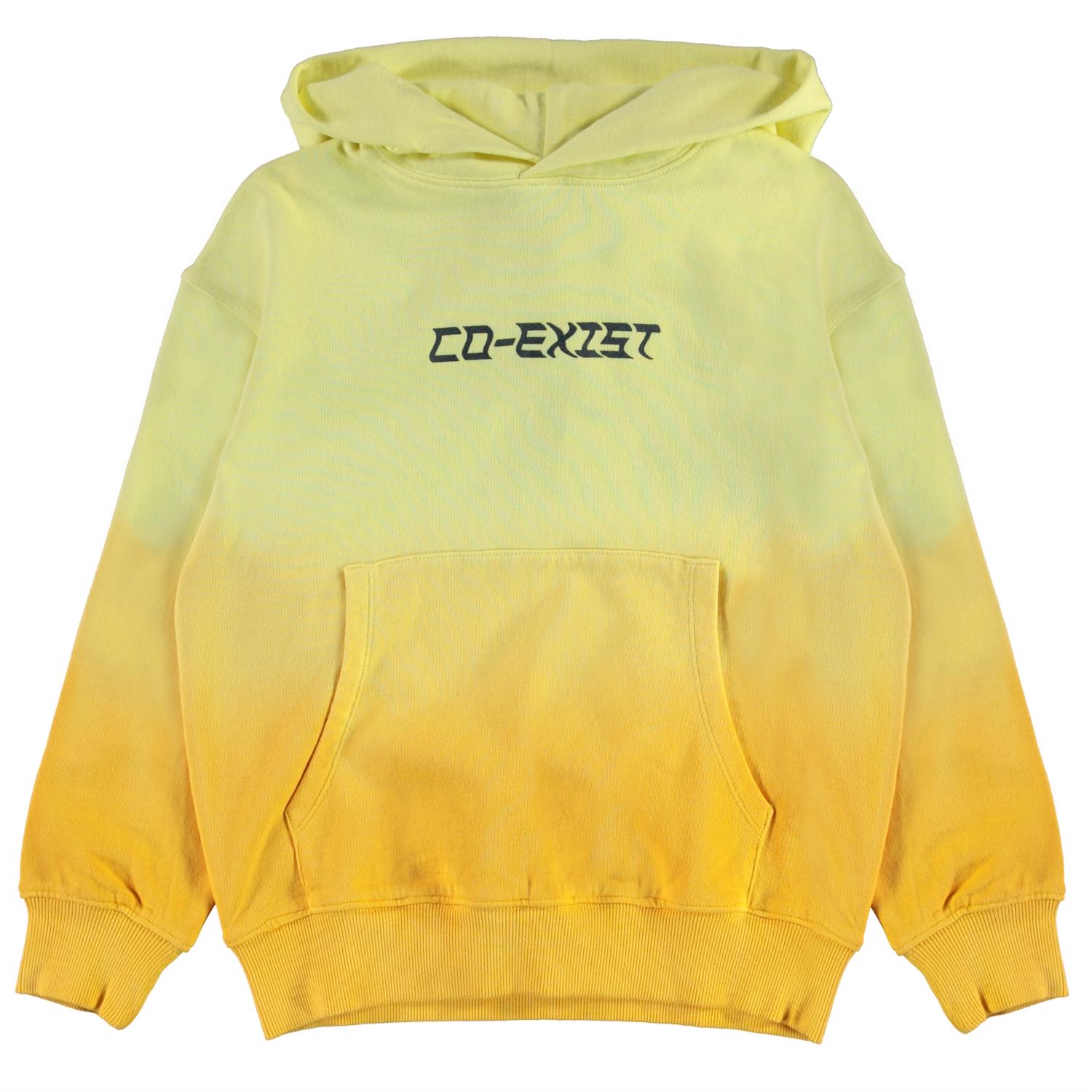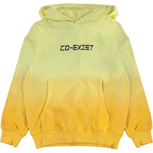 Matt er en gul tie-dye hoodie, hvor den gul farver changerer og bliver mørkere og kraftigere i bunden. Blusen har kænguro lomme og 'Co-exist' printet på fronten.