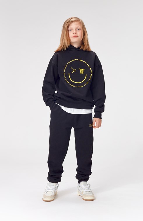 Matt er en sort sweatshirt hoodie, med et atypisk en smiley i gul. Matt har rib ved håndled og hofte.Denne Molo vare er fremstillet i certificeret økologisk bomuld.