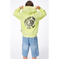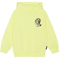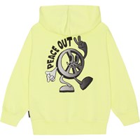 "Lys gul økologisk hoodie med pleceret print. Printet er en optismistisk peacetegnfigur, som selv smider et peacetegn og et smil ud til verden. Lille på fronten, stor på ryggen.