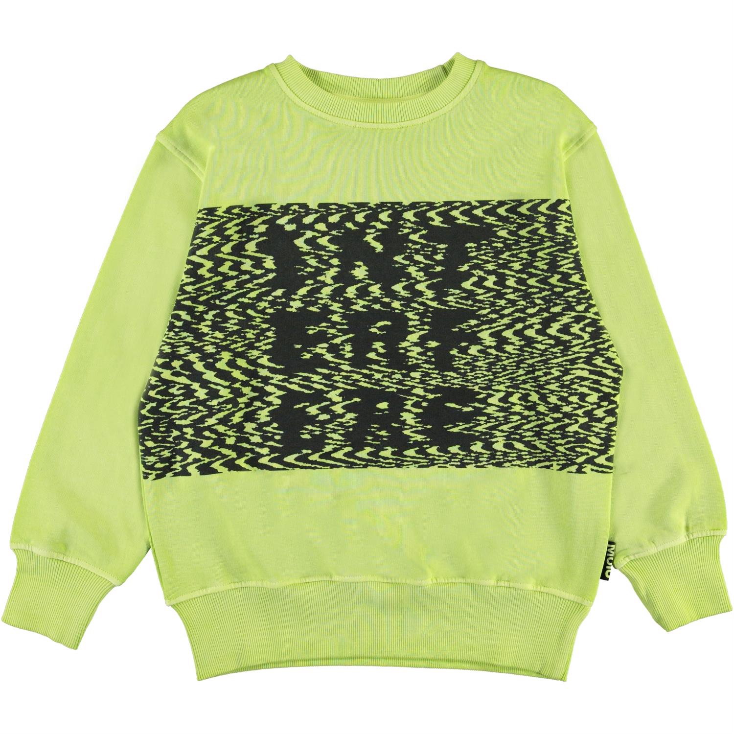 Mattis er en neon grøn sweatshirt med sort print på fronten med teksten 'Interfere'.