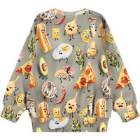 Grå sweatshirt i blødt økologisk bomuld med ribkanter ved hals, ærmer og i bunden af blusen. Sweatshirten har en almindelig pasform og et print af mad med ansigter.