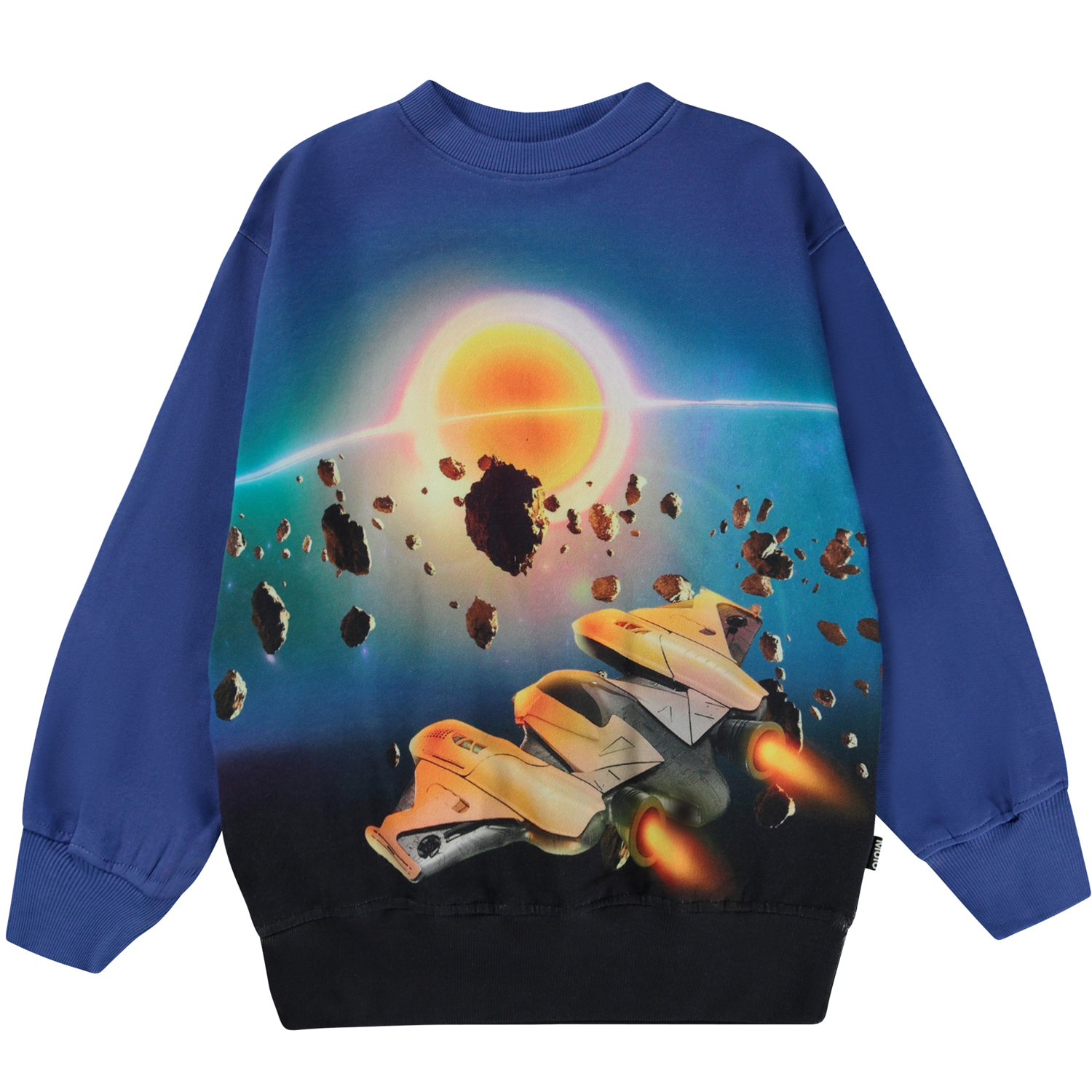Klar blå sweatshirt med space placement print. På printet ses rumskibe og UFO’er, der flyver hurtigere end lysets hastighed. Pas på alle farerne derude! Man skal være en dygtig pilot, for at kunne flyve sikkert igennem asteroidebæltet. Printet er i klare blå farver med den orange sol i centrum. Denne sweatshirt er fremstillet i 100% bomuld, har en rund halsudskæring med ribkant, ribkant ved hofte og ærmer, samt et regulært fit.