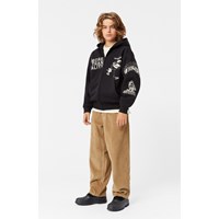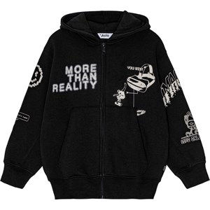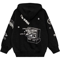Sort/hvid hoodie i økologisk bomuld med lynlås, hætte, kængurulomme, og ribkant ved ærme og hofte. Trøjen har en løs pasform og alloverprint. Printet er baseret på elementer med referencer til computerspil og den virtuelle verden, hvidt på sort.