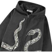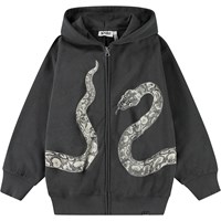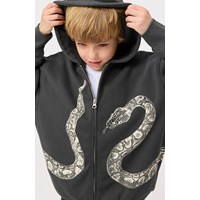 Mørkegrå hættetrøje med lynlås i blødt bomuld samt ribkanter ved håndled og i bunden. Hættetrøjen har en oversize pasform og er lavet uden sidesøm, så slangeprintet kan fortsætte flot rundt om kroppen. Kombiner med matchende shorts for et komplet sæt.