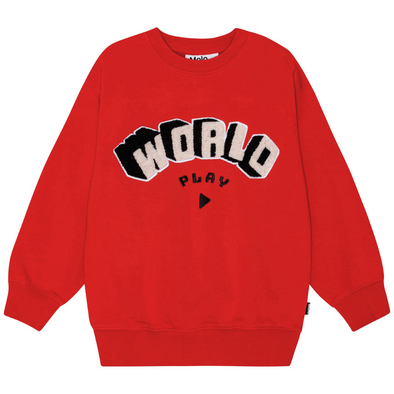 Rød sweatshirt i økologisk bomuld med en børstet inderside, der gør den dejligt blød og varm at have på. Sweatshirten har en almindelig pasform, rund halsudskæring, ribkanter samt et placeret broderi på fronten af teksten "World Play" i farverne sort, hvid og offwhite.