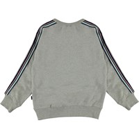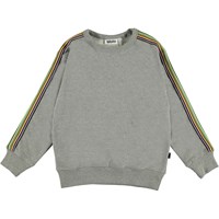 Mik er en grå sweatshirt med flerfarvede striber ned langs ærmerne.