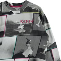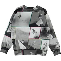 Mik er en grå sweatshirt med farvede firkante og print af snowboarders.