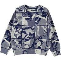 Mik er en blå sweatshirt med sports billeder inddelt i forskellige kasser, som skaber et flot print.