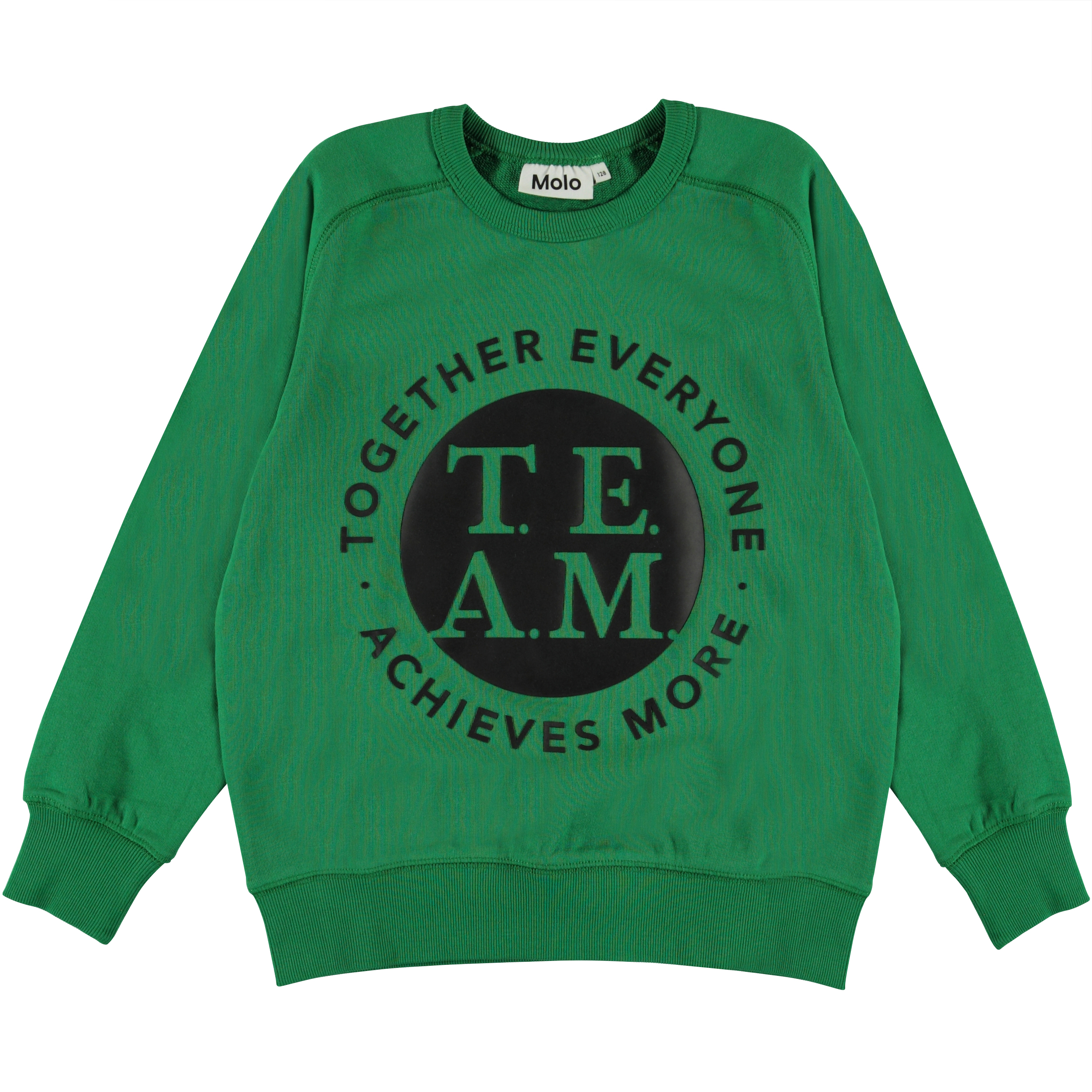 Mike er en grøn sweatshirt med teksten 'Team' på fronten.